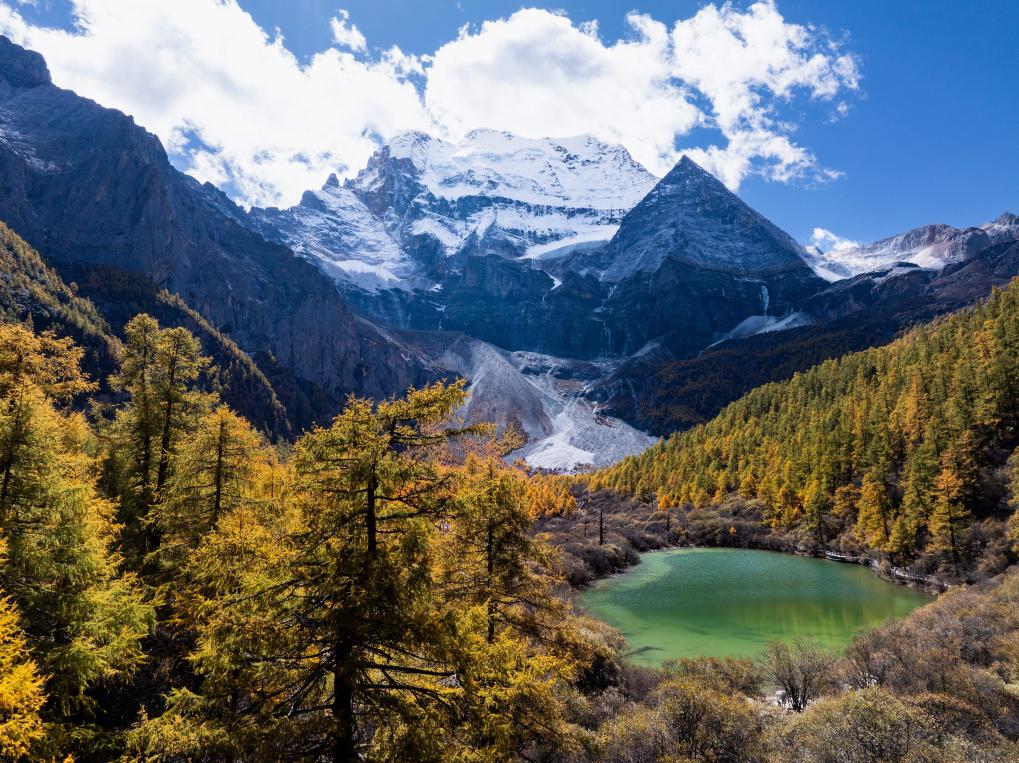 稻城亞丁仙乃日雪山下的湖泊卓瑪拉措掩映在彩林中(2025年10月26日攝,無人機(jī)照片)。新華社記者江宏景 攝