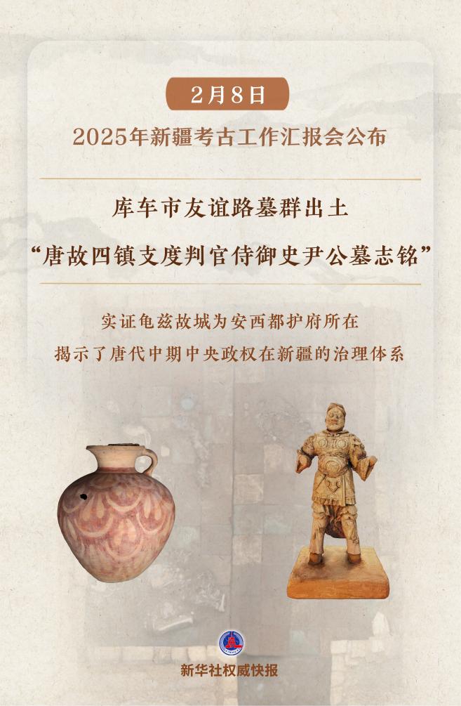 2月8日在京舉行的2025年新疆考古工作匯報會上,公布了庫車市友誼路墓群等“實證歷代中央政權有效管轄治理新疆”考古新發(fā)現(xiàn)。