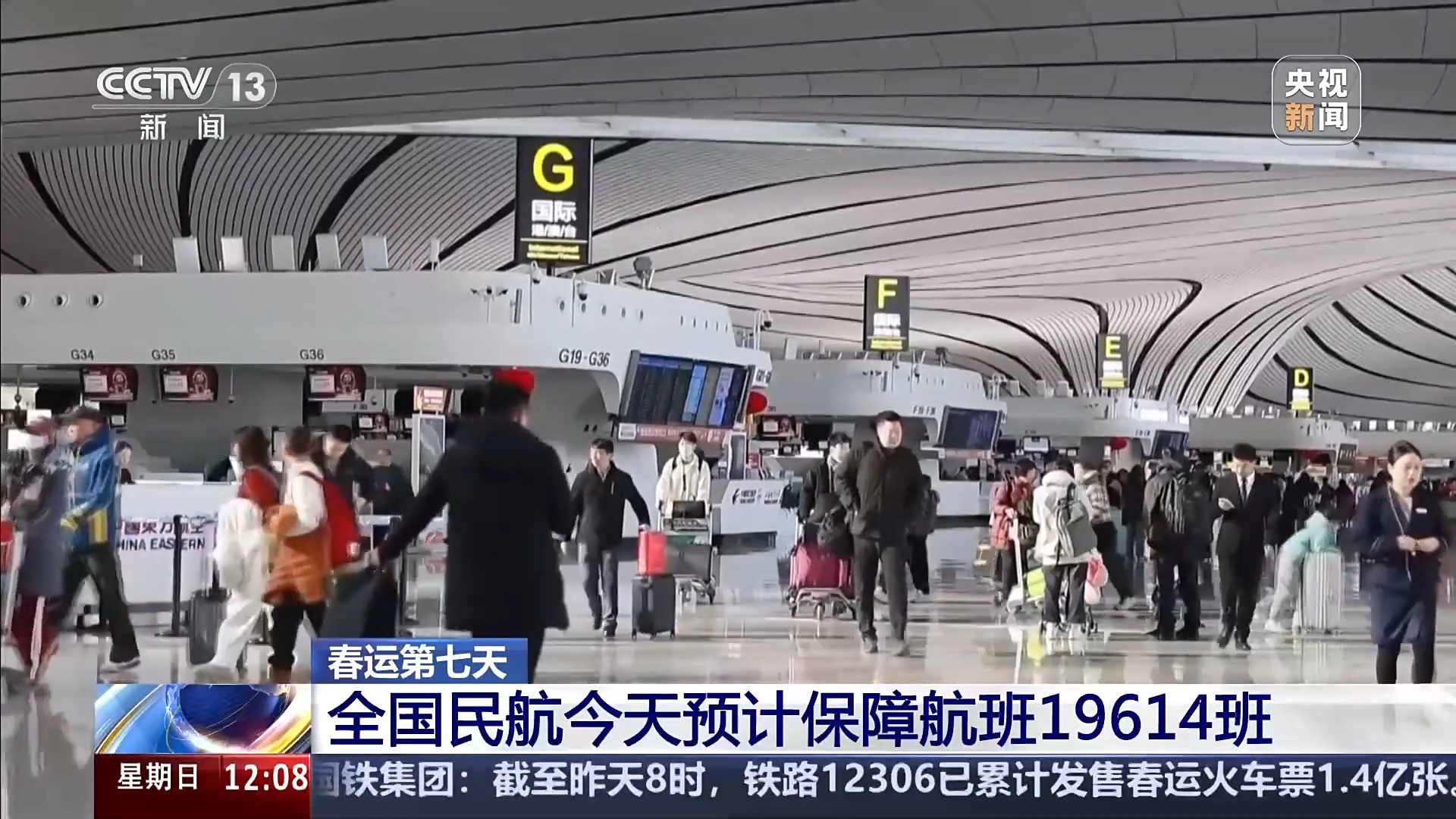 全國民航今天預(yù)計(jì)保障航班19614班,可提供座位數(shù)297萬個(gè),預(yù)計(jì)運(yùn)輸旅客239萬人次。