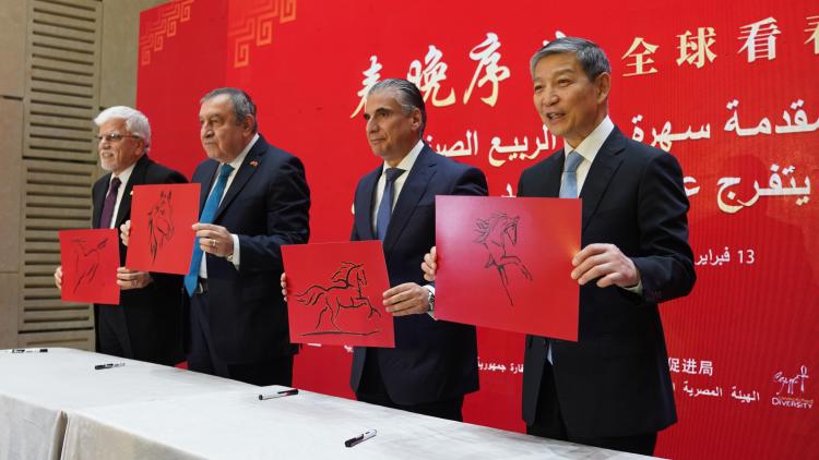 當?shù)貢r間2月13日,“春晚序曲 全球看春晚”埃及專場活動在開羅舉行。本次活動由中國中央廣播電視總臺與中國駐埃及大使館、埃及旅游和文物部、埃及旅游促進局共同主辦。中宣部副部長、中央廣播電視總臺臺長慎海雄作視頻致辭。中國駐埃及大使兼駐阿盟全權代表廖力強,埃及政府代表、埃及外交部亞洲事務部助哈姆扎,埃及前總理沙拉夫出席活動并致辭。埃及考古學家、前文物部長哈瓦斯,埃及旅游促進局主席代拉提芙,埃及外交事務委員會執(zhí)行主任伊扎特,巴德爾大學副校長巴斯歐尼,阿盟非洲事務司司長布斯坦吉,阿盟理事會秘書處主任法赫米等中埃兩國政界、學術界、媒體界代表200余名嘉賓參加活動。