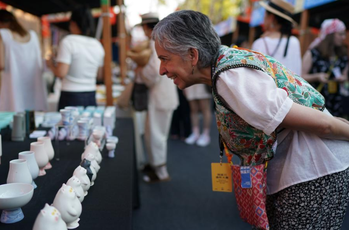 2025年10月17日,在江西景德鎮(zhèn)舉行的2025中國景德鎮(zhèn)國際陶瓷博覽會同期舉辦的陶瓷嘉年華上,一位外國藝術家正在欣賞陶瓷作品。圖源:新華社