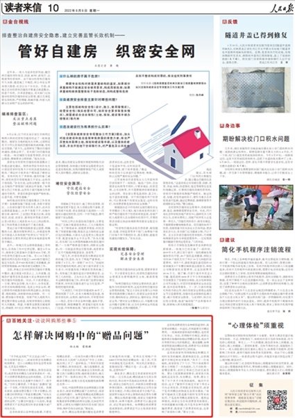 2022年6月6日,《人民日報》讀者來信版“百姓關注”欄目《怎樣解決網購中的“贈品問題”》一文則關注了“人民投訴”平臺用戶“下單時頁面顯示有贈品卻未收到,客服回應是贈品有限、隨機抽取買家”等線上商家的失信行為。