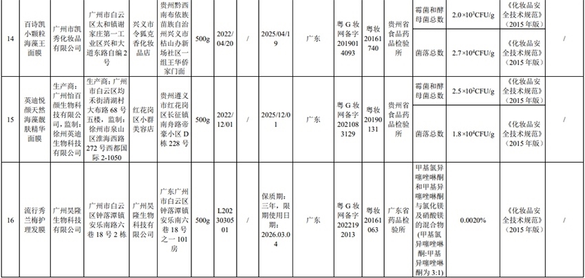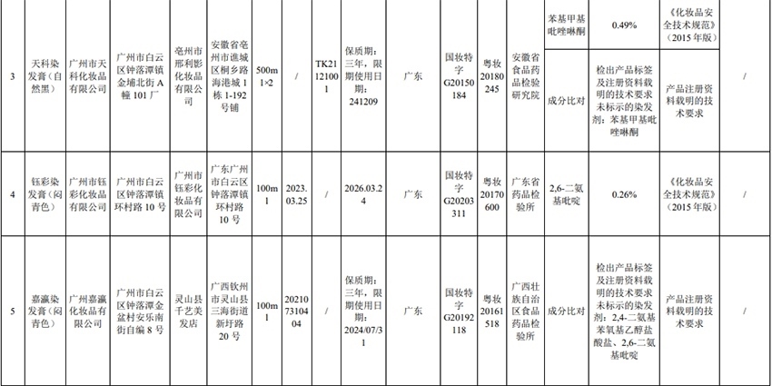 通告顯示,本次不符合規(guī)定的23批次化妝品涉及廣州市天科化妝品有限公司、廣州市鈺彩化妝品有限公司、廣州嘉瀛化妝品有限公司、廣州市白云區(qū)雅頓化妝品廠、廣州有孚精細化工有限公司、廣州雅升生物科技有限公司等,包括染發(fā)膏、防曬乳、面膜、保濕霜等產(chǎn)品。