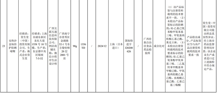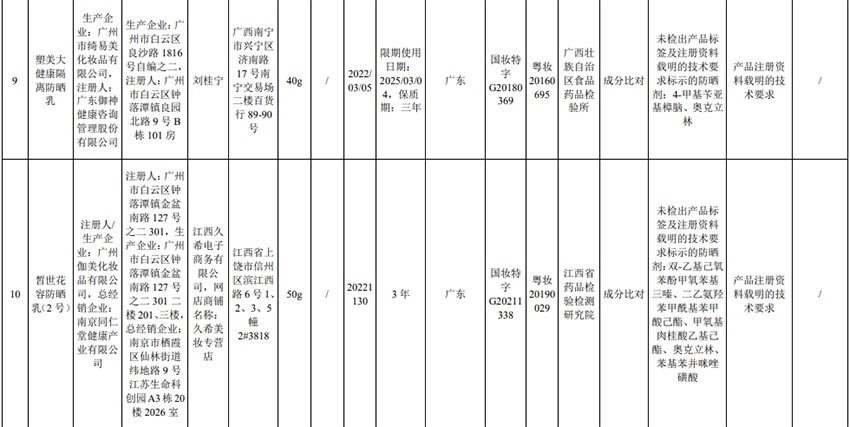 記者注意到,其中,產(chǎn)品標簽標示為歐萊雅(中國)有限公司生產(chǎn)的蘭蔻輕透水漾防曬乳(標示批號:78W200)“未檢出產(chǎn)品標簽及注冊資料載明的技術(shù)要求標示的防曬劑”;產(chǎn)品標簽標示為朋友(上海)化妝品銷售有限公司進口的普柔瑪絲特染發(fā)膏(配合普蓉斯綈雙氧乳)(標示批號:7X15)“檢出產(chǎn)品標簽及注冊資料載明的技術(shù)要求未標示的染發(fā)劑”;產(chǎn)品標簽標示為資生堂(中國)投資有限公司經(jīng)銷的安熱沙金燦倍護防曬啫喱(標示批號:1356TD)“產(chǎn)品標簽與注冊資料載明的技術(shù)要求不一致”、“未檢出產(chǎn)品標簽標示的防曬劑”、“未檢出注冊資料載明的技術(shù)要求標示的防曬劑”。