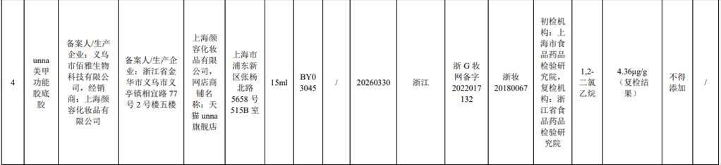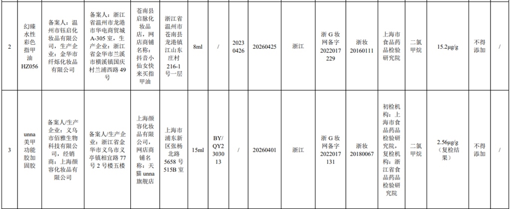 根據(jù)通告,在2023年國家化妝品抽樣檢驗工作中,經(jīng)上海市食品藥品檢驗研究院等單位檢驗,產(chǎn)品標簽標示委托方為溫州市鈺啟化妝品有限公司、受托生產(chǎn)企業(yè)為金華市纖爍化妝品有限公司生產(chǎn)的幻臻水性彩色指甲油HZ088等7批次化妝品不符合規(guī)定,檢出《化妝品安全技術規(guī)范(2015年版)》中規(guī)定的禁用原料。