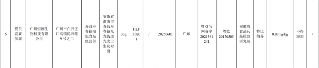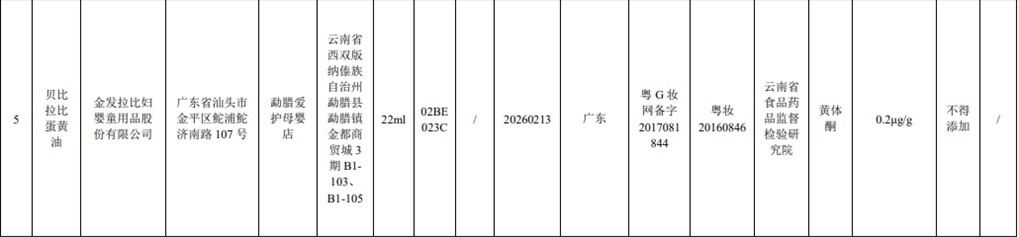 記者注意到,此次通報的7批次含禁用物質化妝品,其中2批次是嬰童產(chǎn)品。產(chǎn)品標簽標示為金發(fā)拉比婦嬰童用品股份有限公司生產(chǎn)的貝比拉比蛋黃油被檢出含有黃體酮;產(chǎn)品標簽標示為廣州恒瀾生物科技有限公司生產(chǎn)的嬰貝萱嬰膚霜被檢出含有特比萘芬。