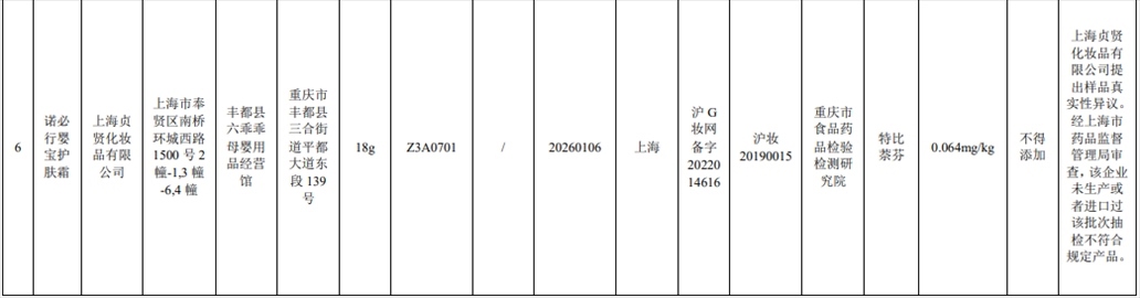 產(chǎn)品標(biāo)簽標(biāo)示為上海貞賢化妝品有限公司生產(chǎn)的諾必行嬰寶護(hù)膚霜檢出不得添加的特比萘芬。(備注:上海貞賢化妝品有限公司提出樣品真實(shí)性異議。經(jīng)上海市藥品監(jiān)督管理局審查,該企業(yè)未生產(chǎn)或者進(jìn)口過該批次抽檢不符合規(guī)定產(chǎn)品。)