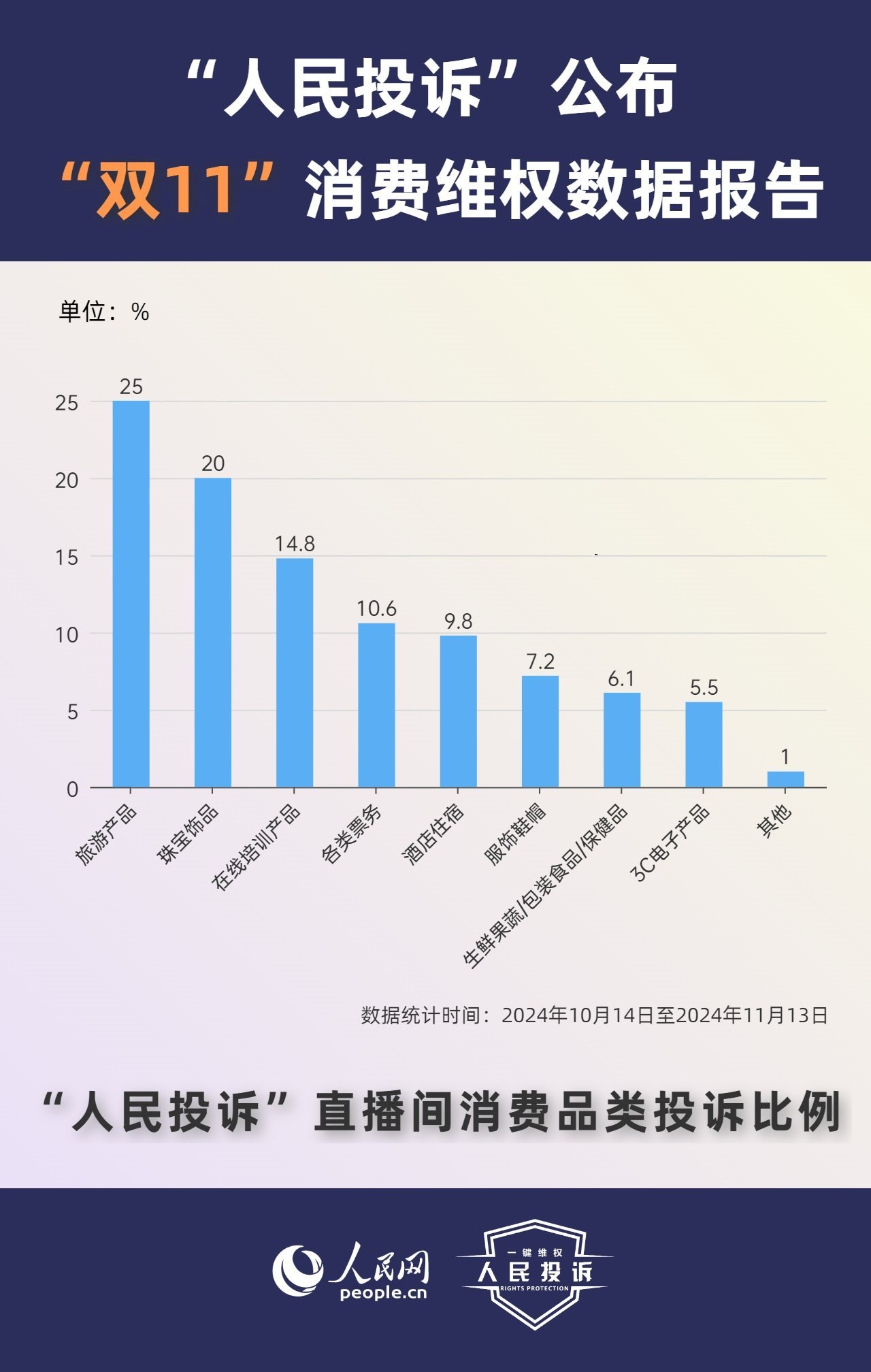 今年“雙11”前夕,人民網(wǎng)“人民投訴”平臺聯(lián)合人民日報“讀者來信”版發(fā)起規(guī)范“直播帶貨”問題建議征集活動。平臺數(shù)據(jù)顯示,活動上線以來,網(wǎng)友通過各渠道的相關(guān)留言量已超千條?!叭嗣裢对V”分析發(fā)現(xiàn),網(wǎng)友投訴直播消費(fèi)多集中在預(yù)付費(fèi)式旅游產(chǎn)品、在線培訓(xùn)產(chǎn)品、珠寶飾品、服裝鞋帽、電子產(chǎn)品、生鮮食品、酒店服務(wù)、娛樂演出票務(wù)、寵物買賣等消費(fèi)品類。其中,旅游套餐投訴占比25%,珠寶飾品交易投訴占比20%,在線培訓(xùn)投訴占比14.8%,各類票務(wù)投訴占比10.6%,酒店住宿投訴占比9.8%,服飾帽類商品投訴占比7.2%,生鮮果蔬/包裝食品/保健品投訴占比6.1%,3C電子產(chǎn)品投訴占比5.5%。