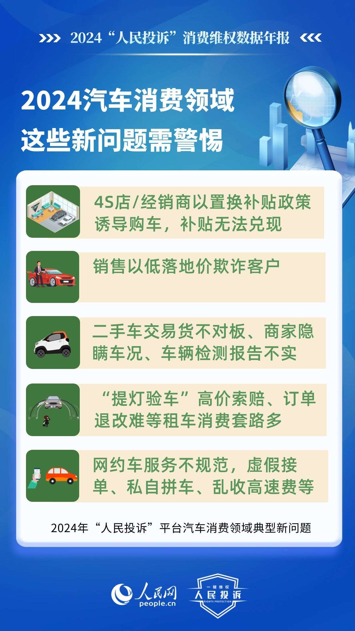 新問題體現(xiàn)在:4S店/經(jīng)銷商以置換補(bǔ)貼政策誘導(dǎo)購車,結(jié)果補(bǔ)貼無法兌現(xiàn);銷售以低落地價欺詐客戶;二手車交易貨不對板、商家隱瞞車況、平臺車輛檢測報告不實;惡意租“故障車”、“提燈驗車”高價索賠、低價誘租、訂單退改難等租車消費(fèi)套路多;網(wǎng)約車服務(wù)不規(guī)范,人車不符、虛假接單、私自拼車、亂收高速費(fèi)等。
