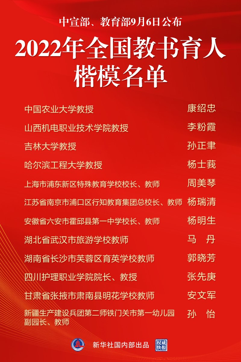 這12位全國教書育人楷模,有的深耕思政課堂、傳播黨的創(chuàng)新理論,有的勇攀科研高峰、取得顯著成果,有的一輩子扎根基層、矢志奉獻(xiàn)山區(qū)教育,有的創(chuàng)新思路方法、為孩子傾注大愛深情,充分展示了新時(shí)代教師隊(duì)伍有理想信念、有道德情操、有扎實(shí)學(xué)識(shí)、有仁愛之心的良好精神風(fēng)貌,是廣大人民教師的優(yōu)秀代表和杰出典范。他們是:中國農(nóng)業(yè)大學(xué)教授康紹忠,山西機(jī)電職業(yè)技術(shù)學(xué)院教授李粉霞,吉林大學(xué)教授孫正聿,哈爾濱工程大學(xué)教授楊士莪,上海市浦東新區(qū)特殊教育學(xué)校校長、教師周美琴,江蘇省南京市浦口區(qū)行知教育集團(tuán)總校長、教師楊瑞清,安徽省六安市霍邱縣第一中學(xué)校長、教師楊明生,湖北省武漢市旅游學(xué)校教師馬丹,湖南省長沙市芙蓉區(qū)育英學(xué)校教師郭曉芳,四川護(hù)理職業(yè)學(xué)院院長、教授張先庚,甘肅省張掖市肅南縣明花學(xué)校教師安文軍,新疆生產(chǎn)建設(shè)兵團(tuán)第二師鐵門關(guān)市第一幼兒園副園長、教師孫怡。