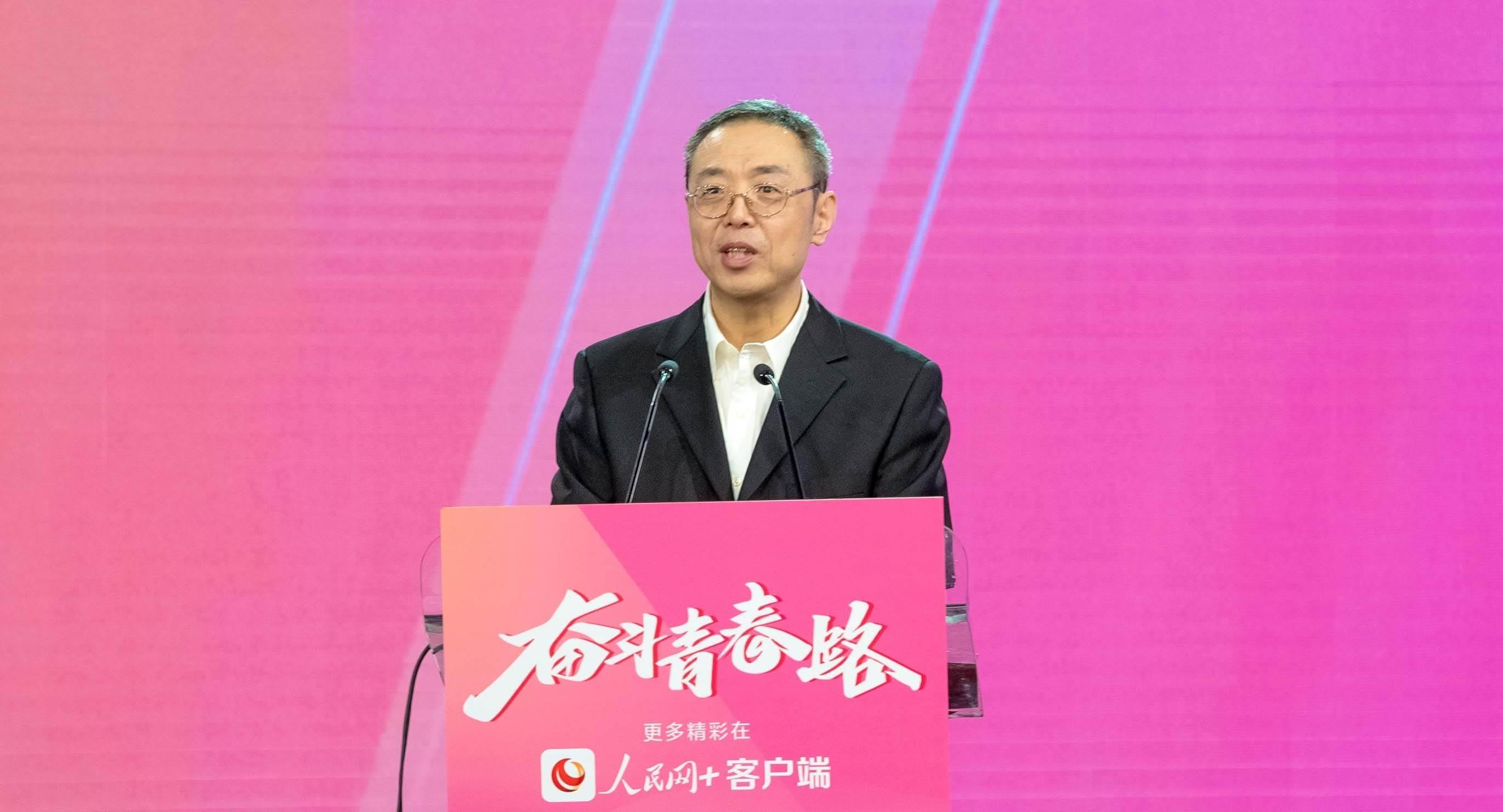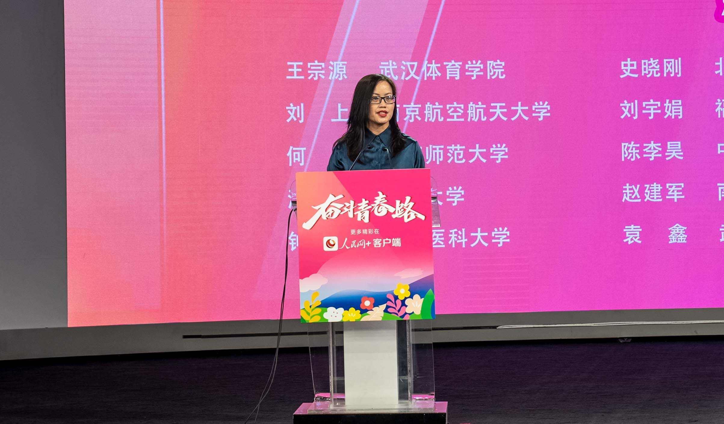 人民網(wǎng)黨委委員、副總裁潘?。ㄓ乙唬榈谑邔谩按髮W(xué)生年度人物”獲獎(jiǎng)學(xué)生頒獎(jiǎng)。實(shí)習(xí)生韓華良 攝
