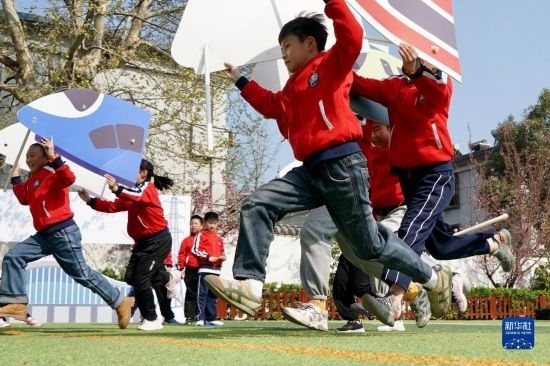 3月31日,徐州市漢橋小學(xué)的學(xué)生進(jìn)行“列車競(jìng)速”游戲。