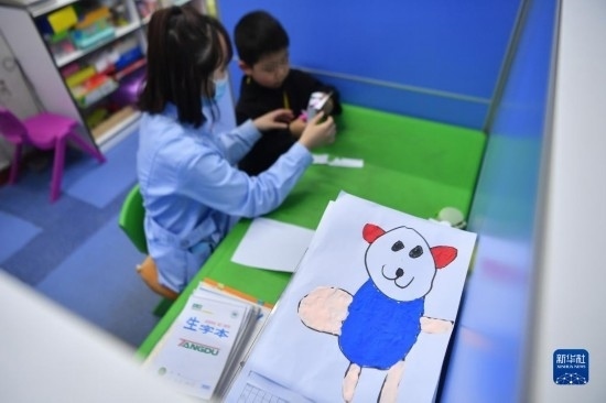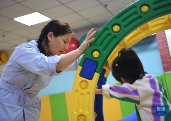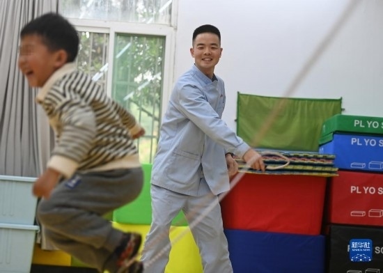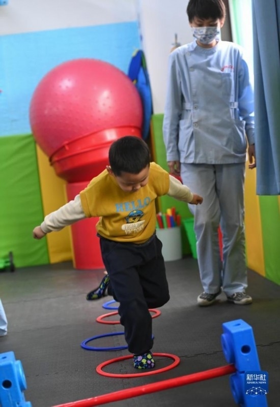3月30日,在西安市金色陽(yáng)光康復(fù)中心,特教老師為孩子進(jìn)行康復(fù)訓(xùn)練。