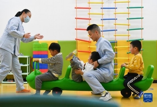 3月30日,在西安市金色陽(yáng)光康復(fù)中心,兩位特教老師(左一、右二)與孩子們一起游戲。