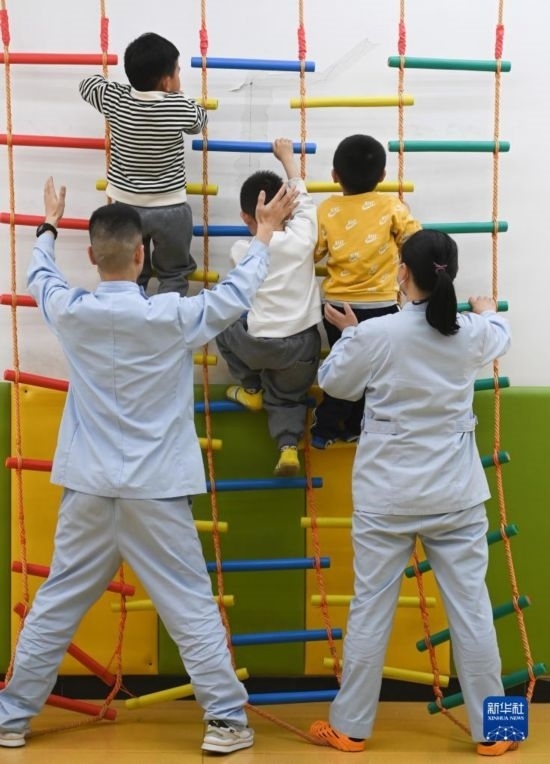 3月30日,在西安市金色陽(yáng)光康復(fù)中心,孩子們?cè)谔亟汤蠋煹谋Wo(hù)下進(jìn)行康復(fù)訓(xùn)練。