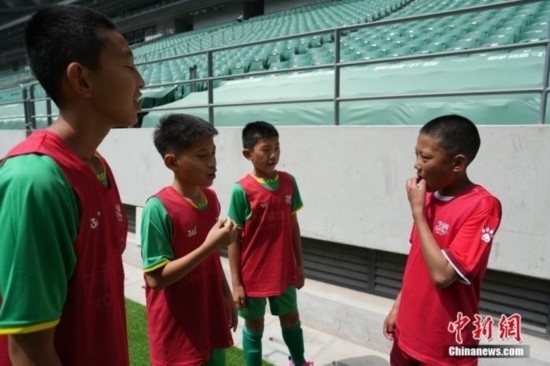 這是孩子們第一次在大型體育場(chǎng)上踢球。教練東周文德說,來(lái)北京前,孩子們問他,“C羅踢球的那種球場(chǎng)在哪?”“工體里面的草都是真草嗎?”