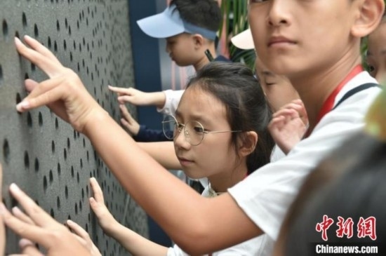 8月7日,學(xué)員用手觸摸國家大劇院內(nèi)的特色墻壁。中新社記者 李駿 攝