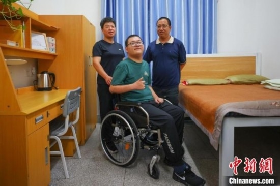 來自江蘇啟東的董亦超前來東南大學(xué)報(bào)到,坐在輪椅上的他在父母的陪同下入住宿舍。泱波 攝