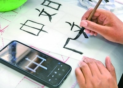 英國倫敦,一名學(xué)生在2023年“國際中文日”英國主題活動上展示自己的書法。新華社發(fā)