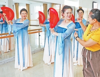 內(nèi)蒙古自治區(qū)呼倫貝爾市扎蘭屯市老年活動(dòng)中心,幾名學(xué)員在老年大學(xué)上舞蹈課。韓穎群攝(影像中國)