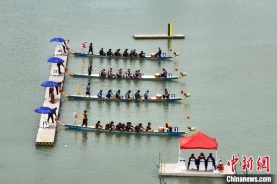 龍舟隊員們在湖面上競技。(無人機(jī)照片)陳家樂攝
