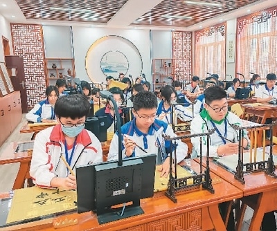 | 5月7日,參加“寧夏歷史文化、自然資源與環(huán)境保育探索之旅”交流活動(dòng)的香港中學(xué)生在寧夏銀川市第六中學(xué)學(xué)寫(xiě)毛筆字。新華社記者 艾福梅攝 |