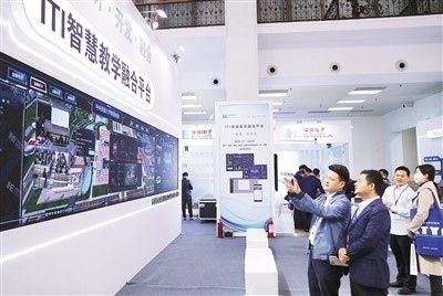 在第33屆(2024年)北京教育裝備展示會(huì)上,觀眾參觀智慧教學(xué)融合平臺(tái)。張秀科攝(人民圖片)
