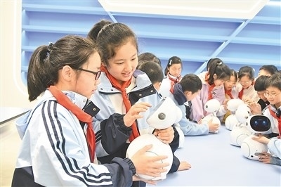 江西省上饒市廣豐區(qū)洋口中心小學(xué)人工智能教室里,學(xué)生們?cè)诶蠋煹闹笇?dǎo)下開(kāi)展人工智能科普課程。朱文標(biāo)攝(人民圖片)