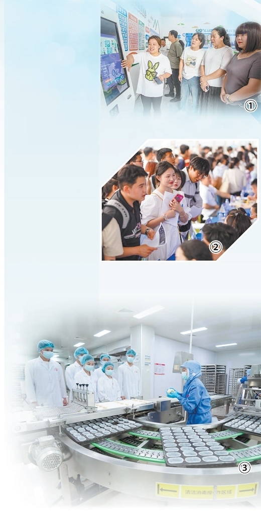 圖①:5月29日,河北邯鄲市復(fù)興區(qū)齊村居民在零工小站找工作。聶長青攝 圖②:6月2日,求職者在南昌大學(xué)參加高校畢業(yè)生雙選會(huì)。史港澤攝 圖③:日前,某職校學(xué)生在福建晉江市一家食品工廠參加實(shí)訓(xùn)。謝貴明攝
