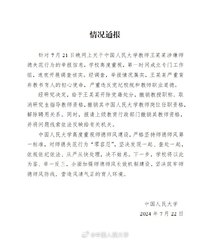 通報中稱,學(xué)校高度重視,第一時間成立專門工作組,連夜開展調(diào)查核實(shí)。經(jīng)研究決定,給予王某某開除黨籍處分,撤銷教授職稱,取消研究生指導(dǎo)教師資格,撤銷其中國人民大學(xué)教師崗位任職資格,解除聘用關(guān)系。同時,報請上級教育行政部門撤銷其教師資格,并將問題線索依法反映給有關(guān)機(jī)關(guān)。
