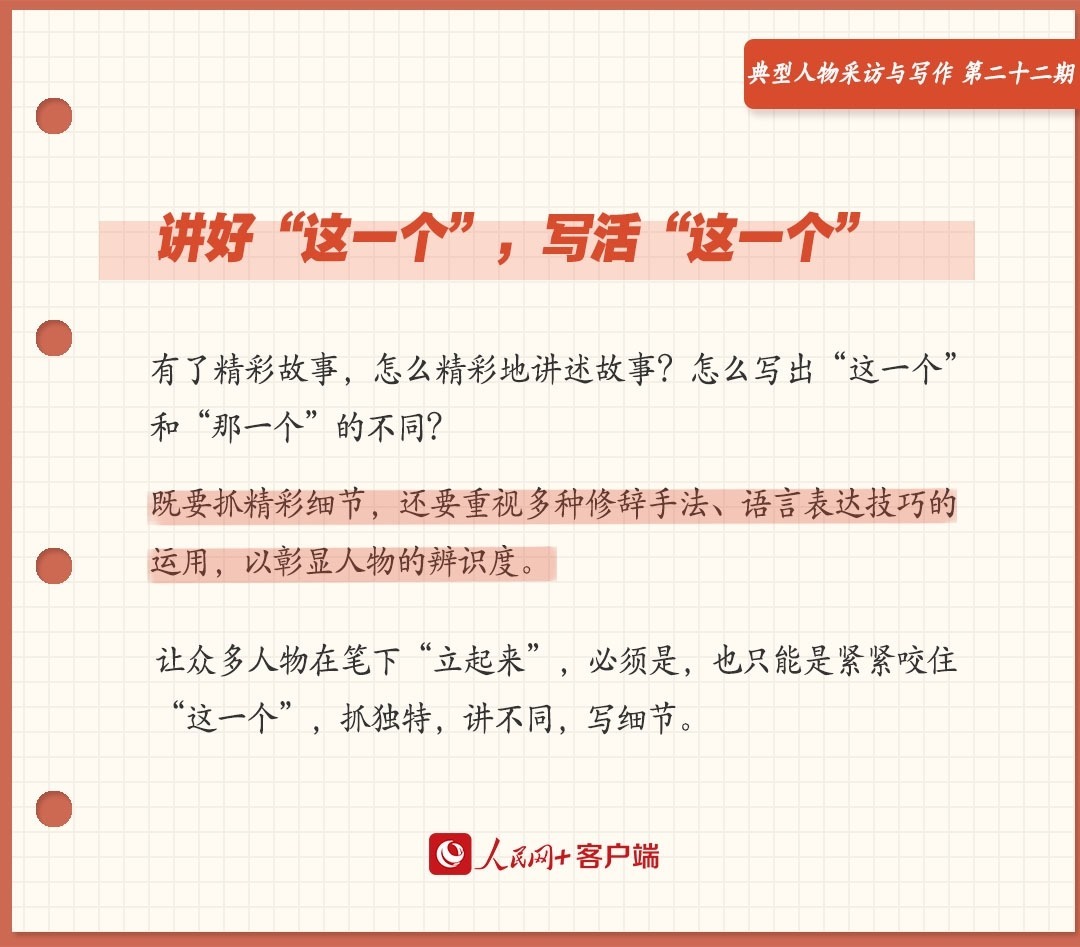 把好故事講精彩,讓“這一個(gè)”立起來(lái),既要抓精彩細(xì)節(jié),還要重視多種修辭手法、語(yǔ)言表達(dá)技巧的運(yùn)用,以彰顯人物的辨識(shí)度。