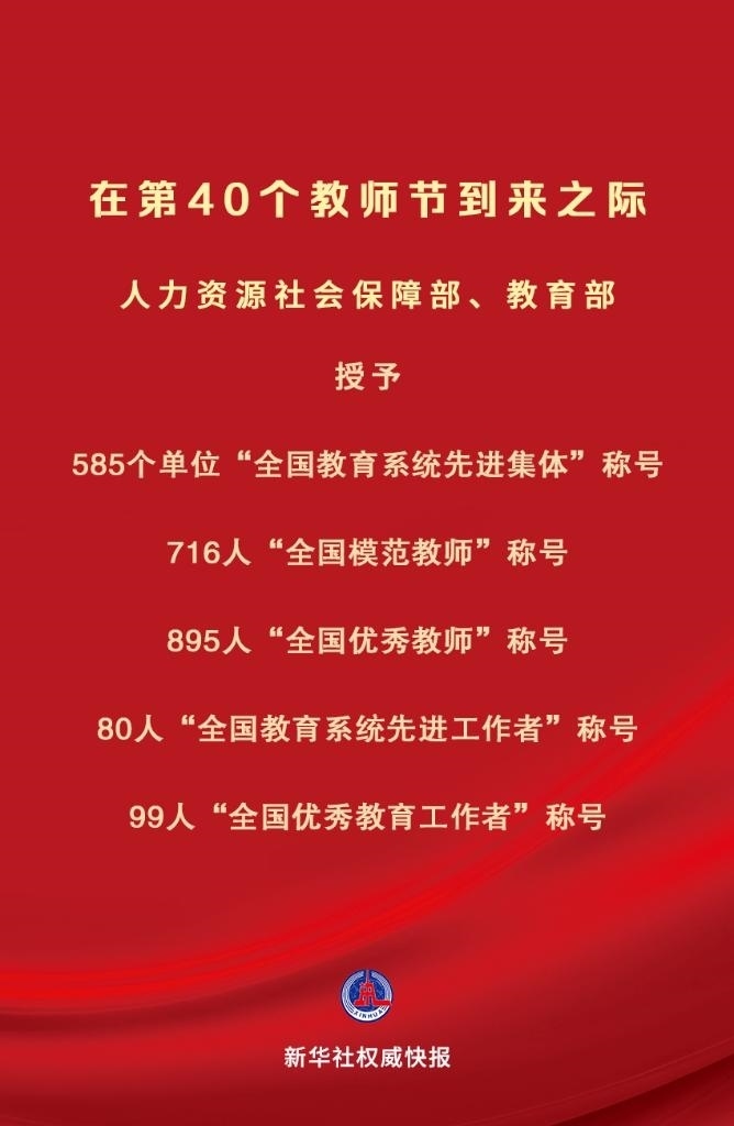 在中華人民共和國成立75周年和第40個教師節(jié)到來之際,為大力弘揚教育家精神,營造全社會尊師重教濃厚氛圍,激勵全國廣大教師和教育工作者落實立德樹人根本任務(wù),積極投身教育強國建設(shè),人力資源社會保障部、教育部決定授予中央財經(jīng)大學金融學院等585個單位“全國教育系統(tǒng)先進集體”稱號;授予刁榮春等716名同志“全國模范教師”稱號;授予于淵等895名同志“全國優(yōu)秀教師”稱號;授予王彥平等80名同志“全國教育系統(tǒng)先進工作者”稱號;授予王軍等99名同志“全國優(yōu)秀教育工作者”稱號。
