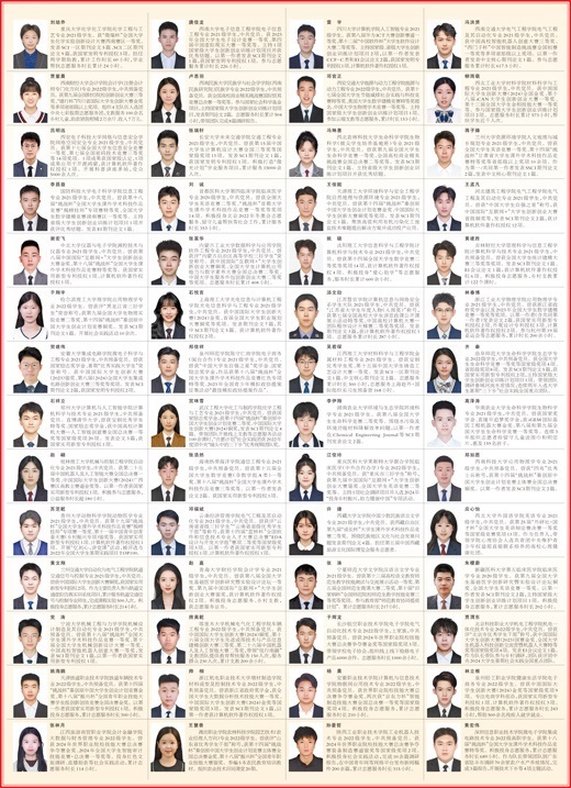 重慶大學化學化工學院化學工程與工藝專業(yè)2021級學生。獲“微瑞杯”全國大學生化學實驗創(chuàng)新設計大賽西南賽區(qū)一等獎。發(fā)表SCI一區(qū)期刊論文5篇、SCI二區(qū)期刊論文9篇,獲國家發(fā)明專利授權3項。擔任兩學期助教,累計工作時長60小時,學業(yè)幫扶志愿服務時長累計24小時。
