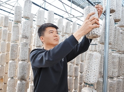 李強(qiáng)在木耳大棚里檢查菌包。