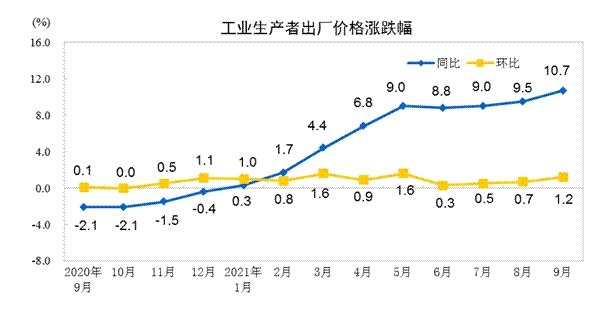 與CPI的溫和上漲不同,受煤炭和部分高耗能行業(yè)產(chǎn)品價格上漲等因素影響,9月PPI漲幅創(chuàng)下了10.7%的新高。