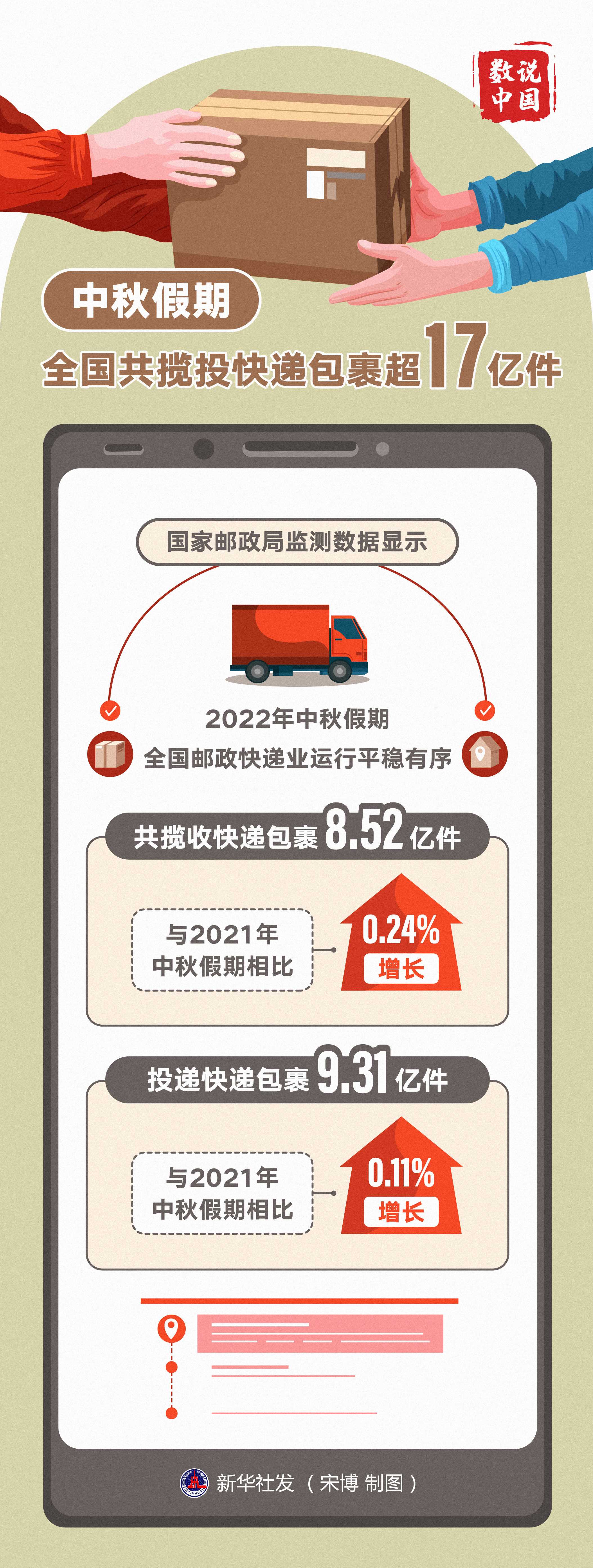 國家郵政局監(jiān)測(cè)數(shù)據(jù)顯示,2022年中秋假期全國郵政快遞業(yè)運(yùn)行平穩(wěn)有序,共攬收快遞包裹8.52億件,與2021年中秋假期相比增長(zhǎng)0.24%;投遞快遞包裹9.31億件,與2021年中秋假期相比增長(zhǎng)0.11%。