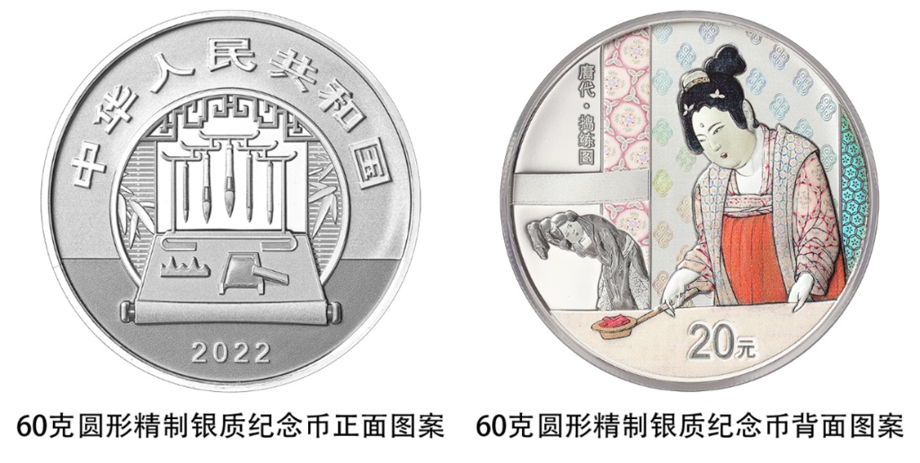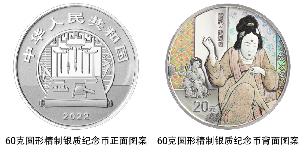 一枚60克圓形銀質(zhì)紀念幣背面圖案為《搗練圖》中熨燙、嬉戲造型,襯以裝飾紋樣組合設(shè)計,并刊“唐代·搗練圖”字樣及面額。