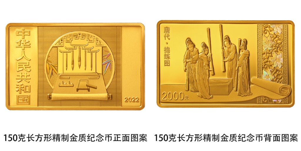該套金銀紀念幣正面圖案均為筆、墨、紙、硯造型,輔以竹葉、窗等裝飾組合設(shè)計,背面圖案則各有特色。一枚150克長方形金質(zhì)紀念幣背面圖案為《搗練圖》中搗練場景,襯以裝飾紋樣組合設(shè)計,并刊“唐代·搗練圖”字樣及面額。