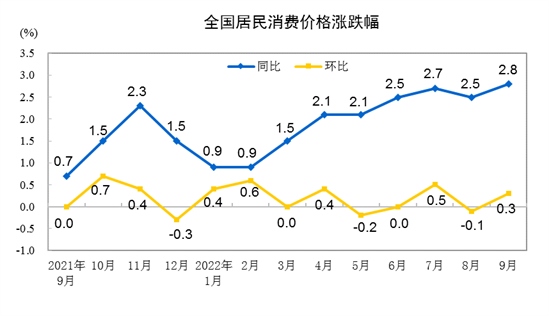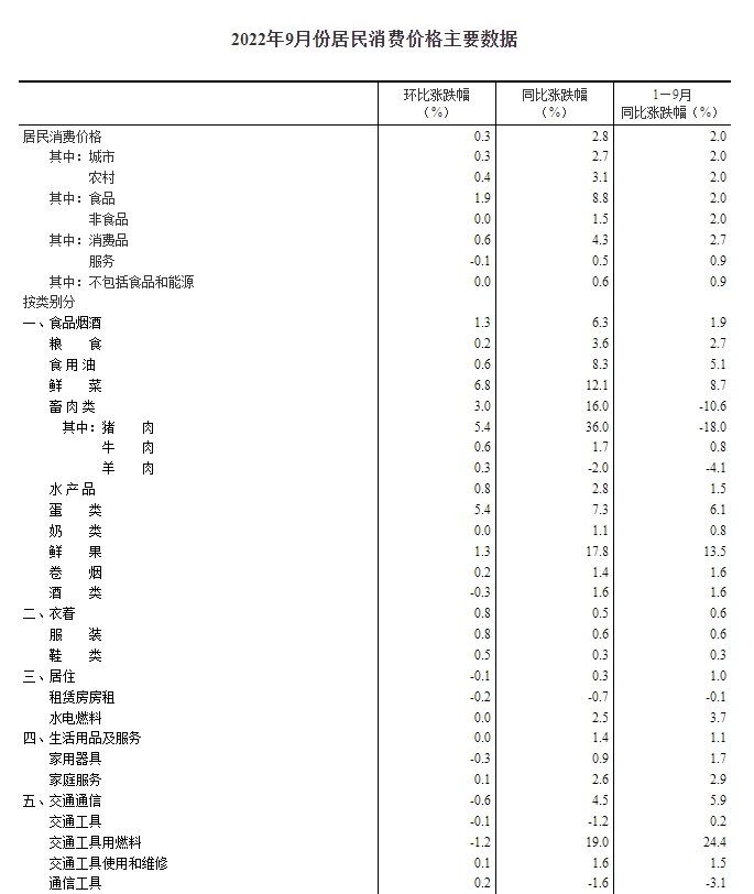 2022年9月份,全國居民消費(fèi)價(jià)格同比上漲2.8%。其中,城市上漲2.7%,農(nóng)村上漲3.1%;食品價(jià)格上漲8.8%,非食品價(jià)格上漲1.5%;消費(fèi)品價(jià)格上漲4.3%,服務(wù)價(jià)格上漲0.5%。1--—9月平均,全國居民消費(fèi)價(jià)格比上年同期上漲2.0%。
