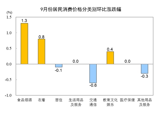 9月份,全國居民消費(fèi)價(jià)格環(huán)比上漲0.3%。其中,城市上漲0.3%,農(nóng)村上漲0.4%;食品價(jià)格上漲1.9%,非食品價(jià)格持平;消費(fèi)品價(jià)格上漲0.6%,服務(wù)價(jià)格下降0.1%。