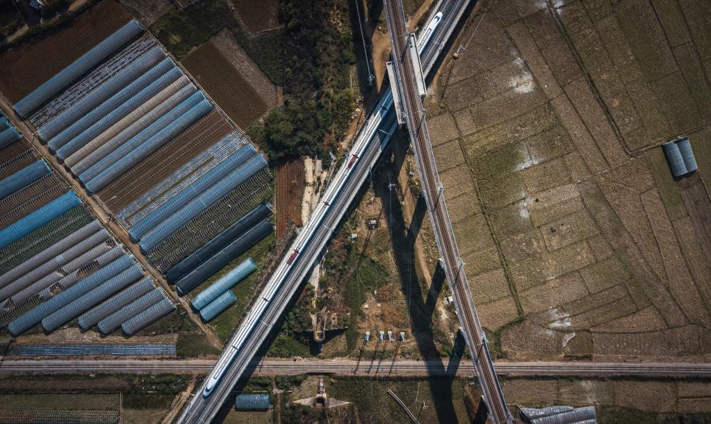 12月16日,列車行駛在與玉河鐵路(上)、滇越鐵路(底層)相互交叉的彌蒙高鐵線(中)(無人機(jī)照片)。新華社記者 王冠森 攝