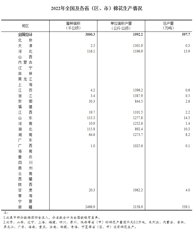 國家統(tǒng)計(jì)局26日公布數(shù)據(jù)顯示,根據(jù)對(duì)全國31個(gè)省(區(qū)、市)的統(tǒng)計(jì)調(diào)查(新疆棉花播種面積通過遙感測量取得),2022年全國棉花播種面積4500.4萬畝,比上年減少41.8萬畝,下降0.9%;單產(chǎn)132.8公斤/畝,比上年增加6.6公斤/畝,增長5.3%;產(chǎn)量597.7萬噸,比上年增加24.6萬噸,增長4.3%。