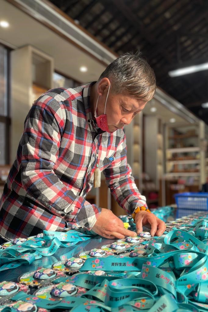 惠山泥人廠高級工藝美術師周漢慶在檢驗登山節(jié)完賽獎牌。新華社記者 朱國亮 攝