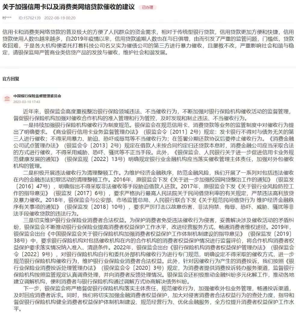 銀保監(jiān)會在回復(fù)中表示,近年來,銀保監(jiān)會高度重視整治銀行保險領(lǐng)域違法、不當(dāng)催收行為,不斷加強對銀行保險機(jī)構(gòu)催收活動的監(jiān)督管理,督促銀行保險機(jī)構(gòu)加強對催收合作機(jī)構(gòu)的準(zhǔn)入管理和行為管控,及時發(fā)現(xiàn)和制止違法、不當(dāng)催收行為。