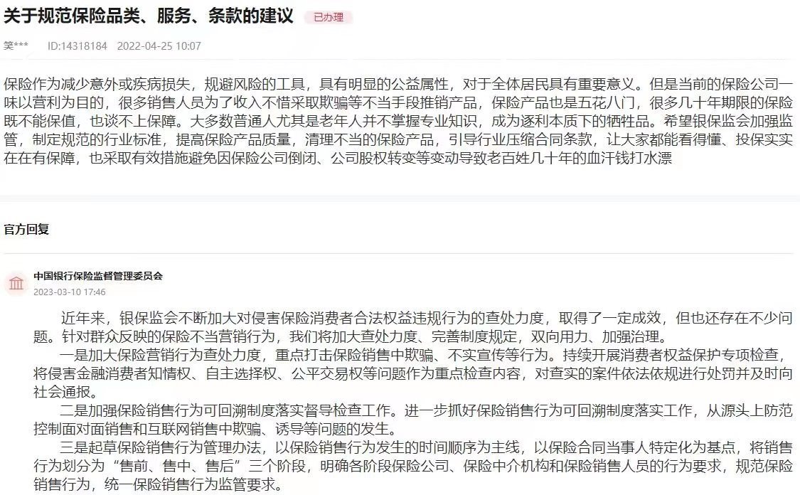 “近年來,銀保監(jiān)會不斷加大對侵害保險消費者合法權(quán)益違規(guī)行為的查處力度,取得了一定成效,但也還存在不少問題?!便y保監(jiān)會在回復(fù)中表示,針對群眾反映的保險不當(dāng)營銷行為,將加大查處力度、完善制度規(guī)定,雙向用力、加強治理。