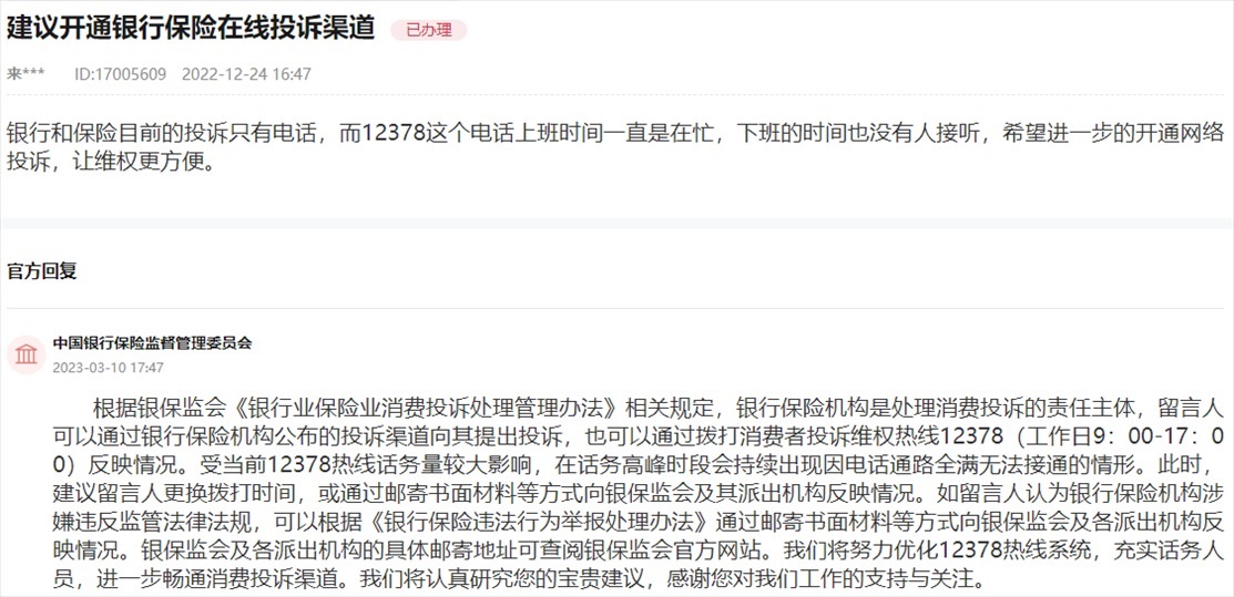 針對網(wǎng)友提出的“建議開通銀行保險在線投訴渠道”,銀保監(jiān)會在回復(fù)中表示,將努力優(yōu)化消費者投訴維權(quán)熱線12378系統(tǒng),充實話務(wù)人員,進(jìn)一步暢通消費投訴渠道。