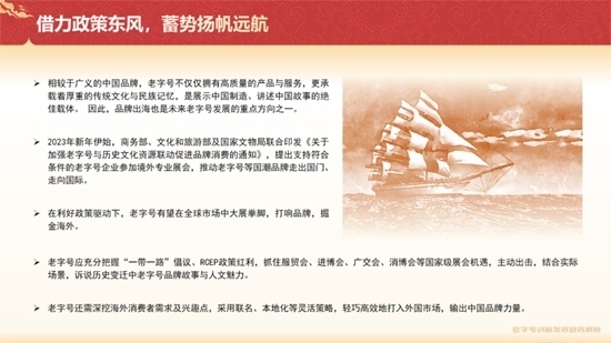《報(bào)告》提到,在利好政策驅(qū)動下,老字號有望在全球市場中大展拳腳,打響品牌,掘金海外。具體來看,老字號應(yīng)充分把握“一帶一路”倡議、RCEP政策紅利,抓住國家級展會機(jī)遇,主動出擊,結(jié)合實(shí)際場景,訴說歷史變遷中老字號品牌故事與人文魅力。