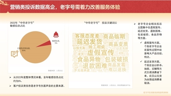 《報(bào)告》同時(shí)指出,在消費(fèi)者側(cè),客戶投訴類信息是老字號負(fù)面聲音的主要來源,老字號企業(yè)相關(guān)投訴主題集中在虛假宣傳、延遲發(fā)貨、退款困難、包裝破損、食品異物等方面。這些問題不僅影響了消費(fèi)者體驗(yàn),也不利于企業(yè)自身保持優(yōu)質(zhì)的聲譽(yù)形象。