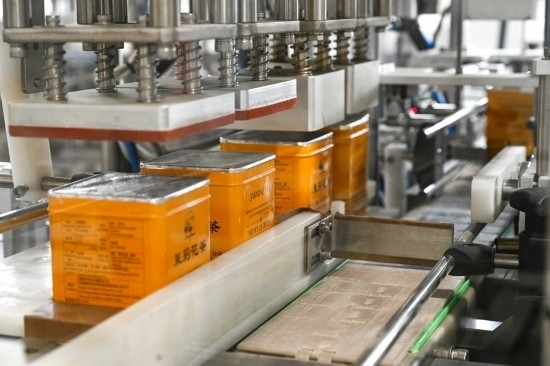 在位于福州市的福建茶葉進出口有限責任公司福興茶葉加工廠流水線上拍攝的罐裝的茉莉花茶(2023年4月11日攝)。新華社記者 周義 攝