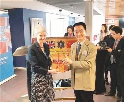 呂景泉(前右)向合作開設英國魯班工坊的英方學校代表贈送中方研發(fā)出版的教材。